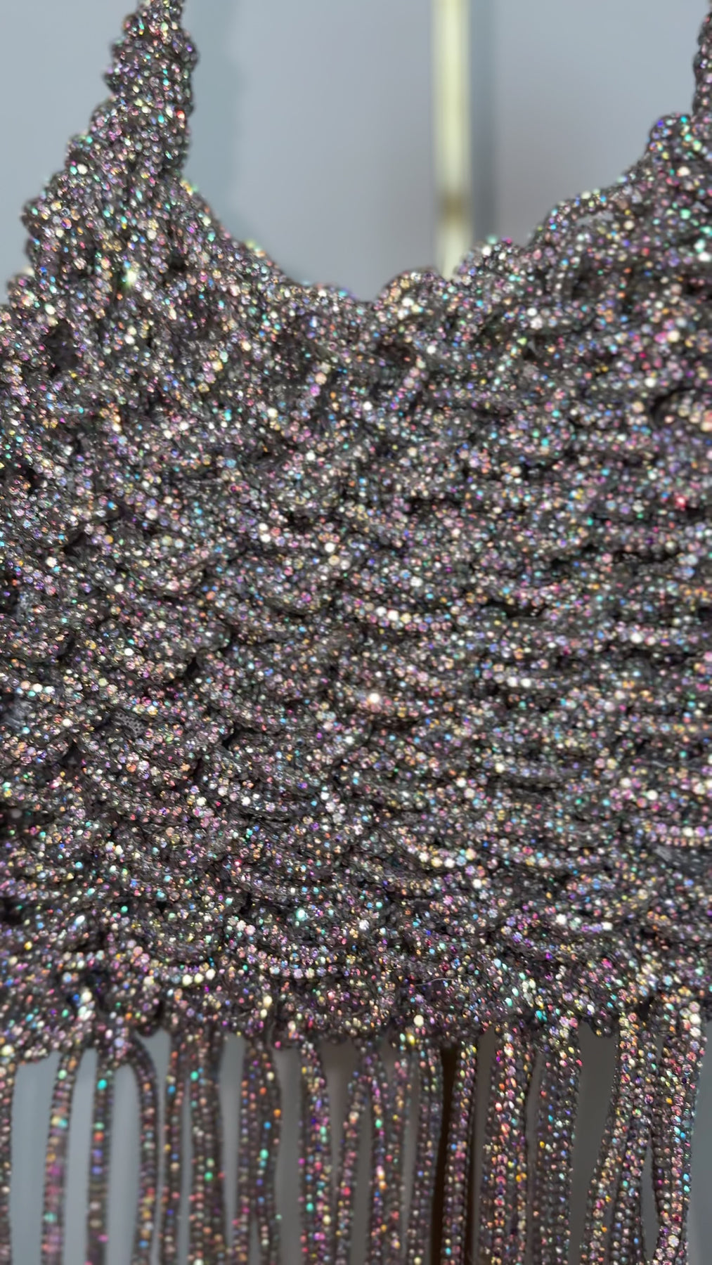 Fun and flirty crystal and metal fringe bag made with natural materials sourced from Southern Italy from heritage brand MELA Jewelry.