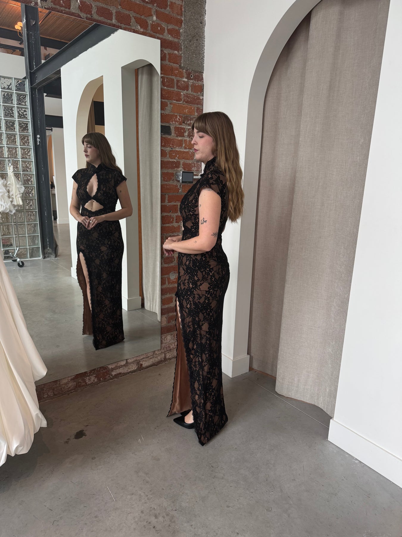 Elevate your presence at life's most coveted moments in this striking black lace gown by Sau Lee. The refined high neckline and impeccably fitted silhouette work together to create an silhouette that photographs beautifully and feels extraordinary to wear. Delicate lace craftsmanship delivers the kind of timeless glamour that belongs on red carpets and award show stages.
