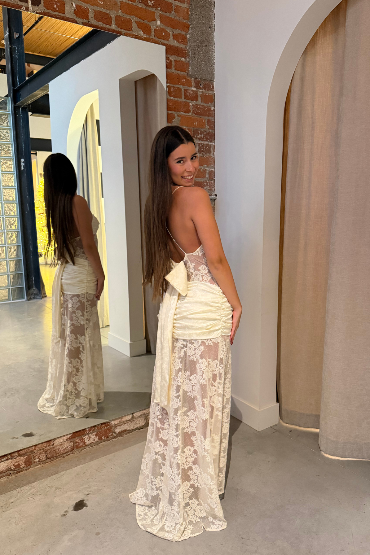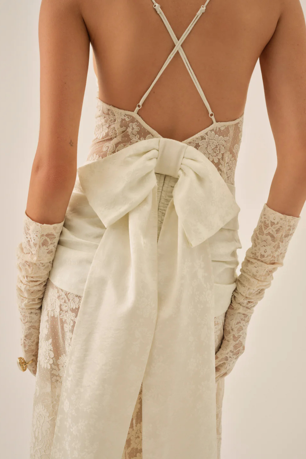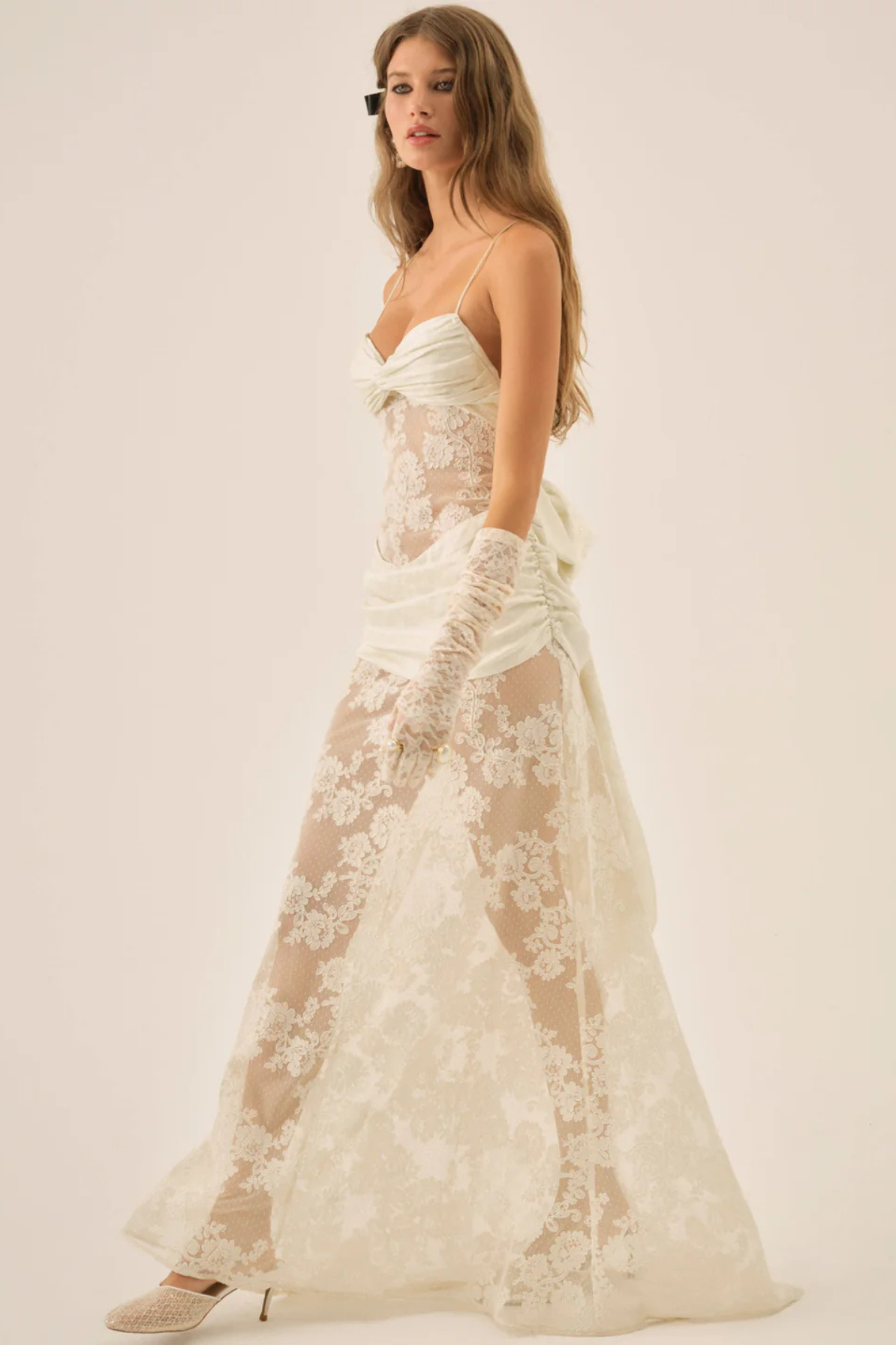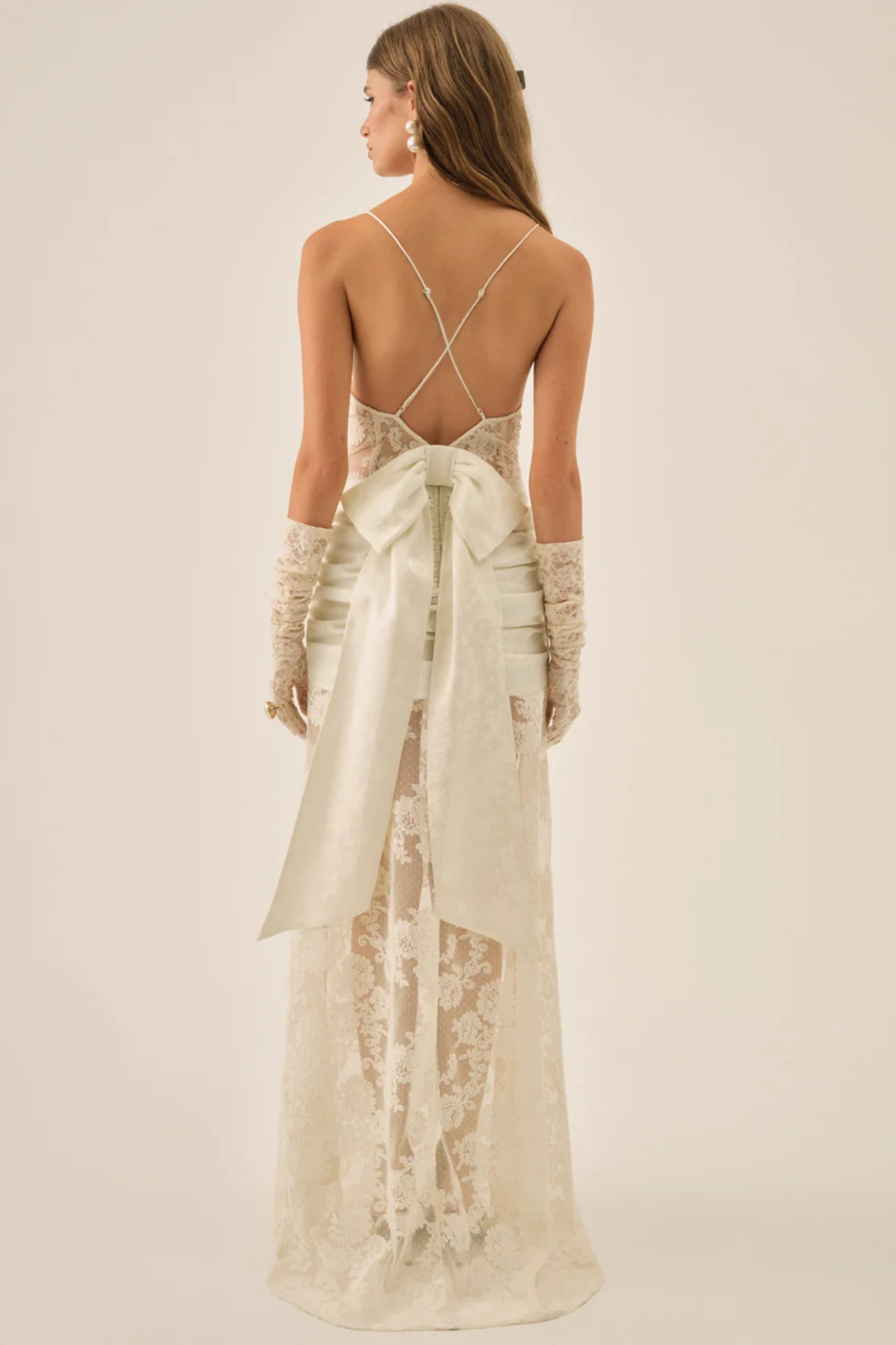 Slip into ethereal elegance with the Cameryn Lace Gown by For Love and Lemons. This daring rental piece features intricate lace detailing that captures an angelic, dreamlike quality—perfect for your honeymoon escape, wedding reception, or rehearsal dinner moment. The delicate bow detail adorning the back adds an unexpected flourish of sophistication. Designed for those who dare to make an unforgettable entrance, this gown transforms any celebration into a fairy tale.