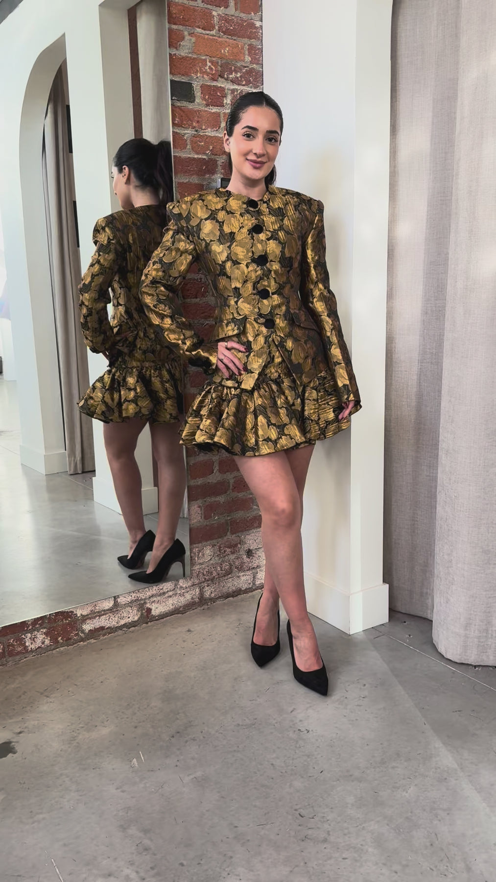 Make an unforgettable entrance in this striking gold floral brocade two-piece suit by Ronny Kobo. The luxurious black and gold palette commands attention, while the sculptural bubble skirt adds architectural drama to every step. Perfect for launch parties, editorial shoots, and moments demanding a bold statement. This chic rental piece delivers high-impact style without the commitment, letting you shine in the most exclusive venues.