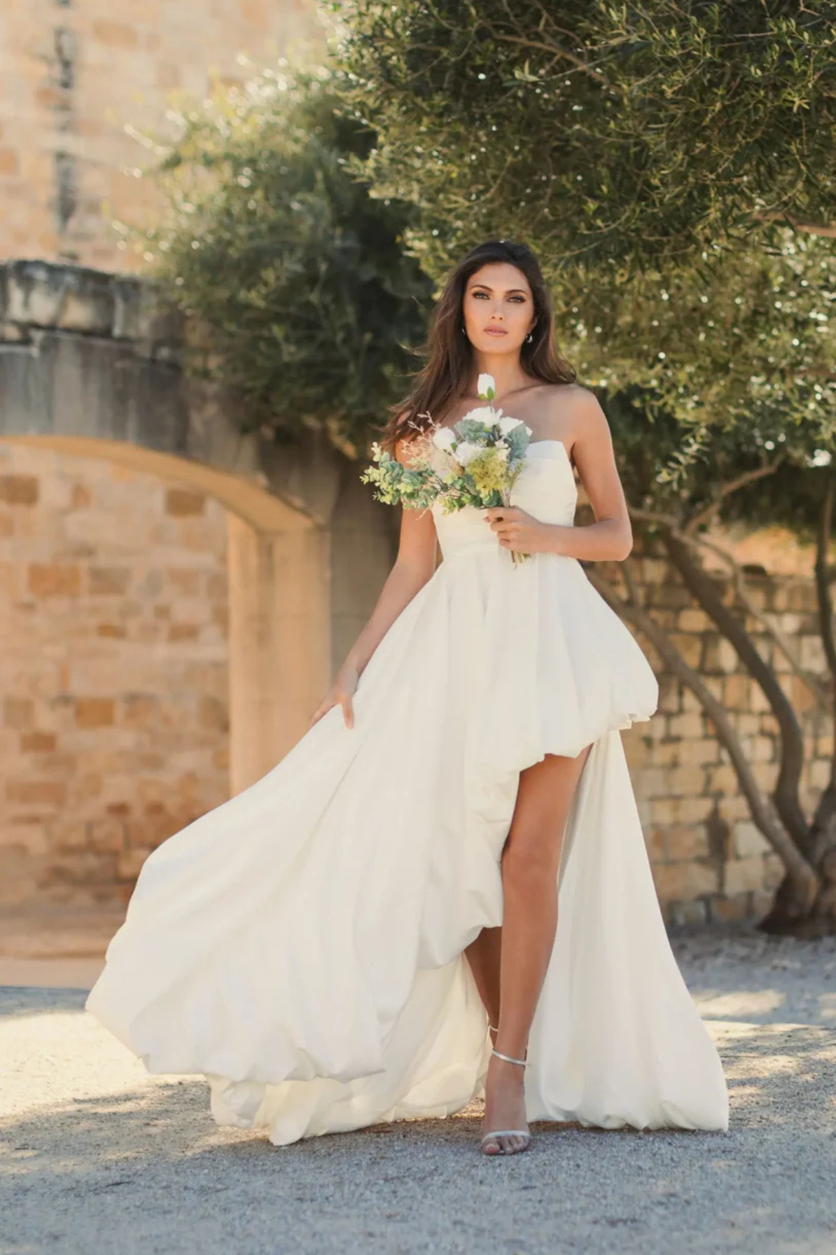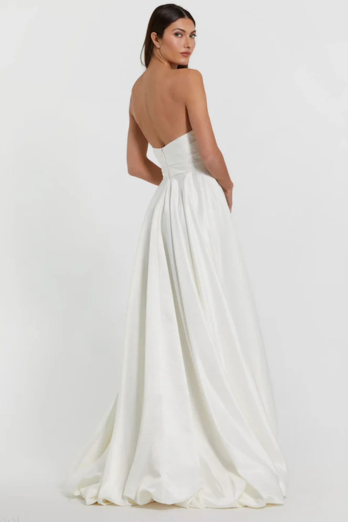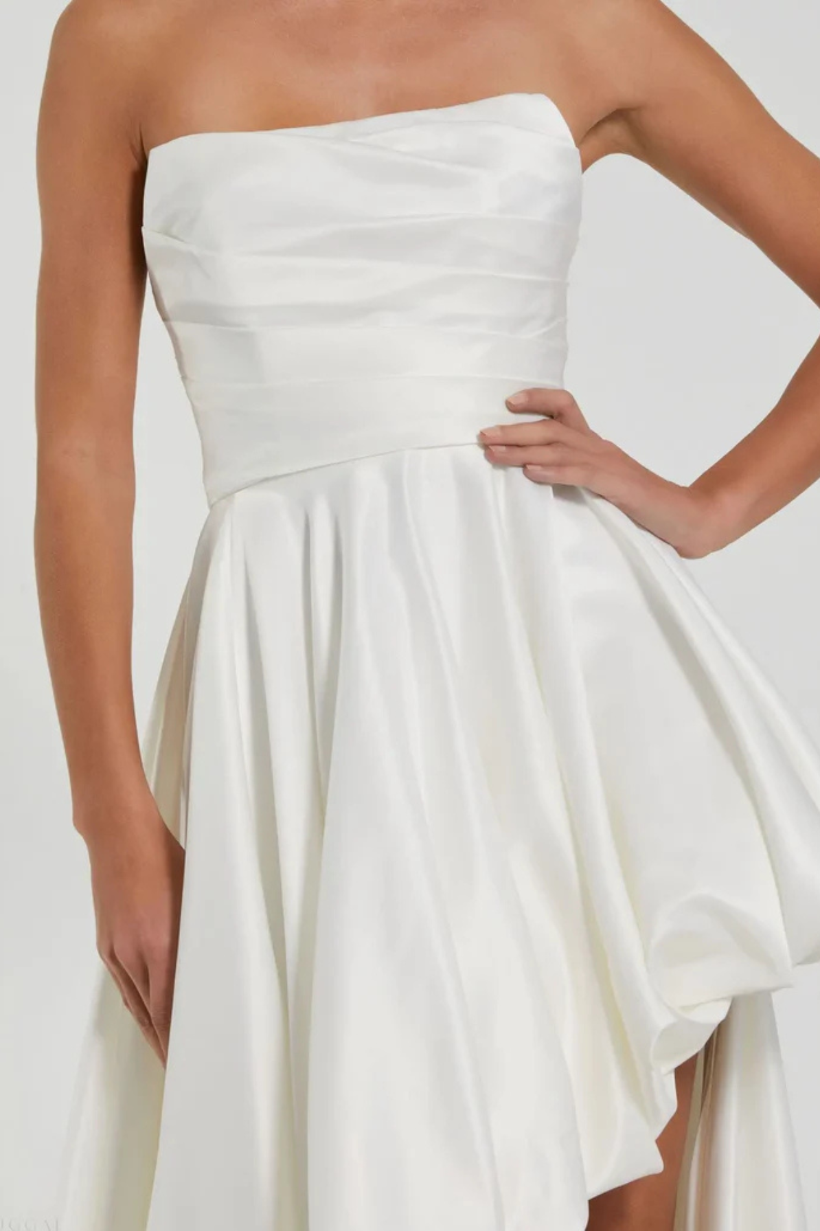 Elevate your wedding day with the Alexandria Strapless Ruched High Low Gown by Mac Duggal. This stunning rental piece combines contemporary elegance with timeless bridal sophistication. The strapless neckline and expertly ruched bodice create a flattering silhouette, while the dramatic high-low hemline adds modern flair and movement. Perfect for the bride who wants to make a bold statement without compromising on classic bridal beauty. Rent this chic gown and walk down the aisle in confidence and style.