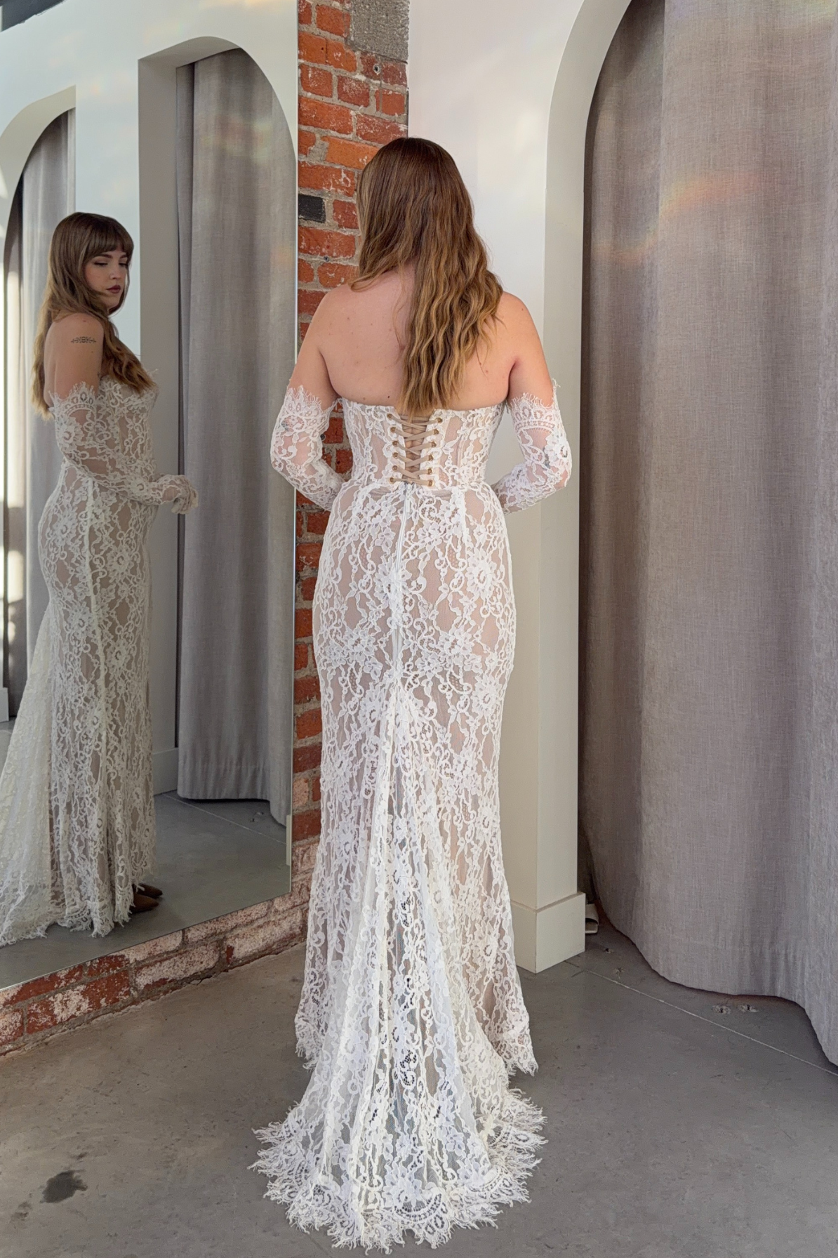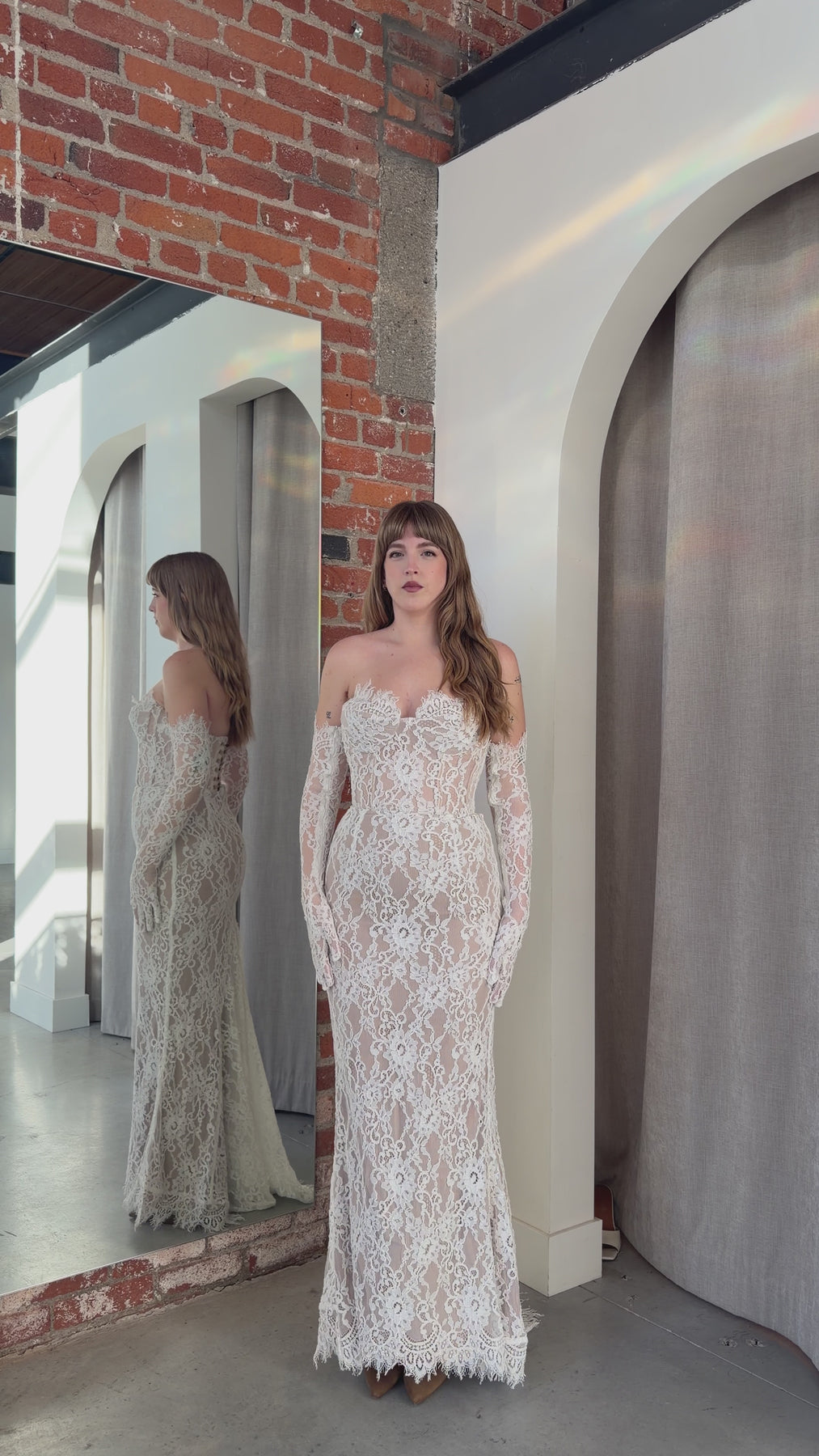 Discover timeless elegance with the Kiana Strapless Lace Gown by Bronx and Banco. This stunning rental piece features delicate lace detailing that captures the essence of romance and sophistication. The strapless silhouette flatters beautifully while the intricate lacework creates an ethereal, dreamy aesthetic perfect for your special day. Crafted for the modern bride seeking understated glamour, this gown delivers luxury without compromise. Make your wedding day unforgettable with a dress that embodies grace and refined beauty.