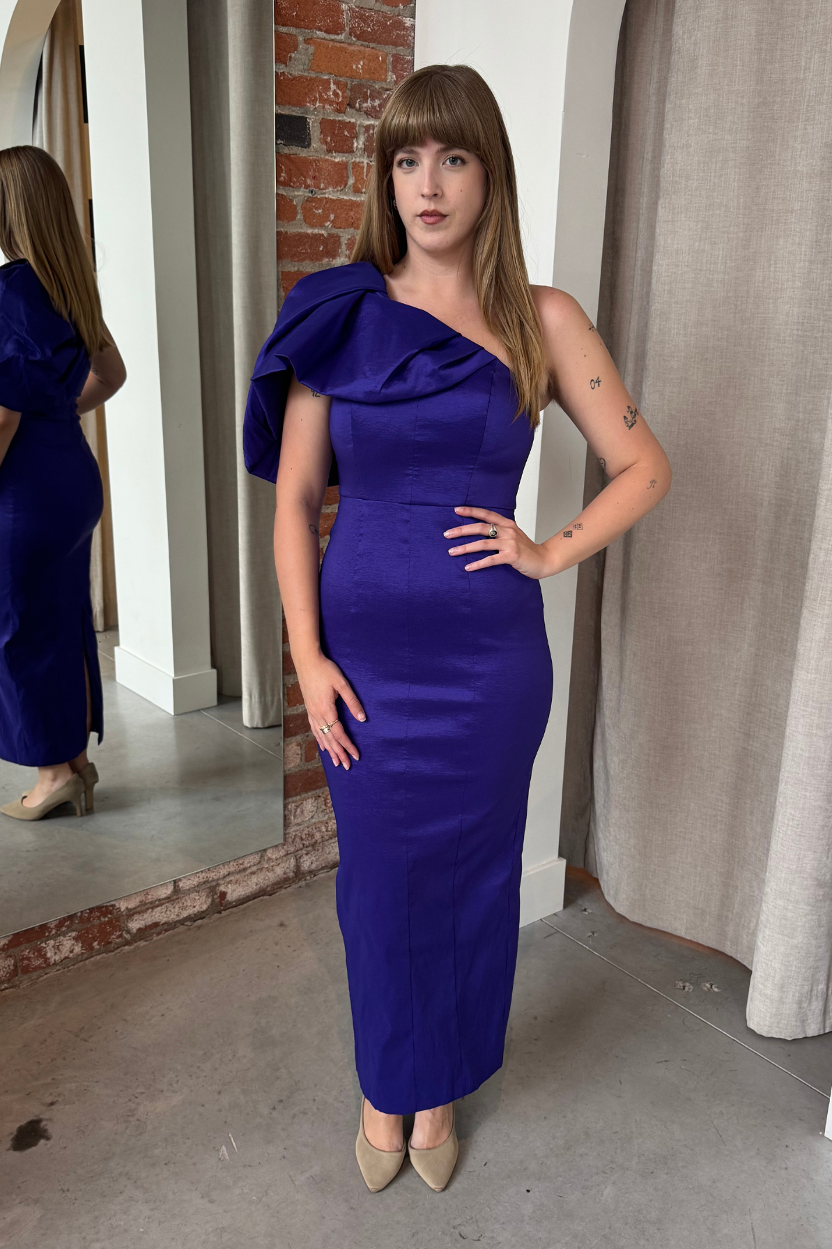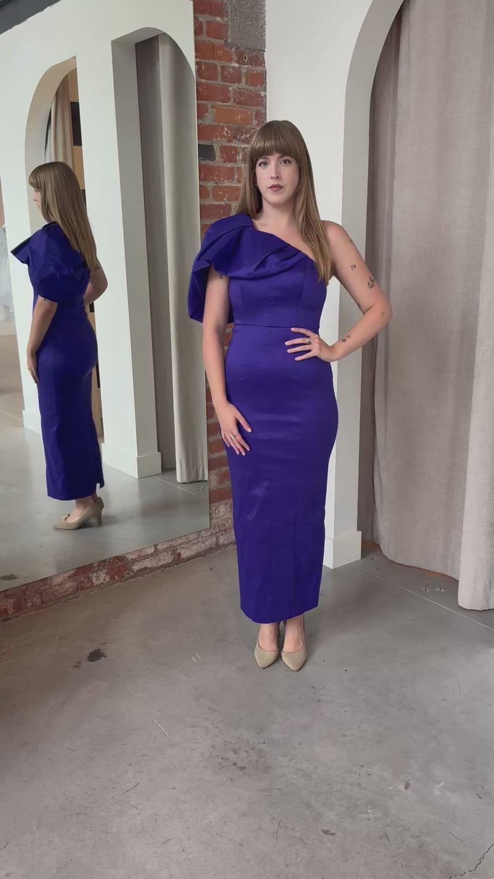 Elevate your evening with the Lanora Gown in Purple. This chic midi dress features a striking one-shoulder design that beautifully accentuates your silhouette. Crafted for a sophisticated look, its rich purple hue adds a regal touch, perfect for special occasions. Rent this elegant piece to make a memorable impression with understated glamour.