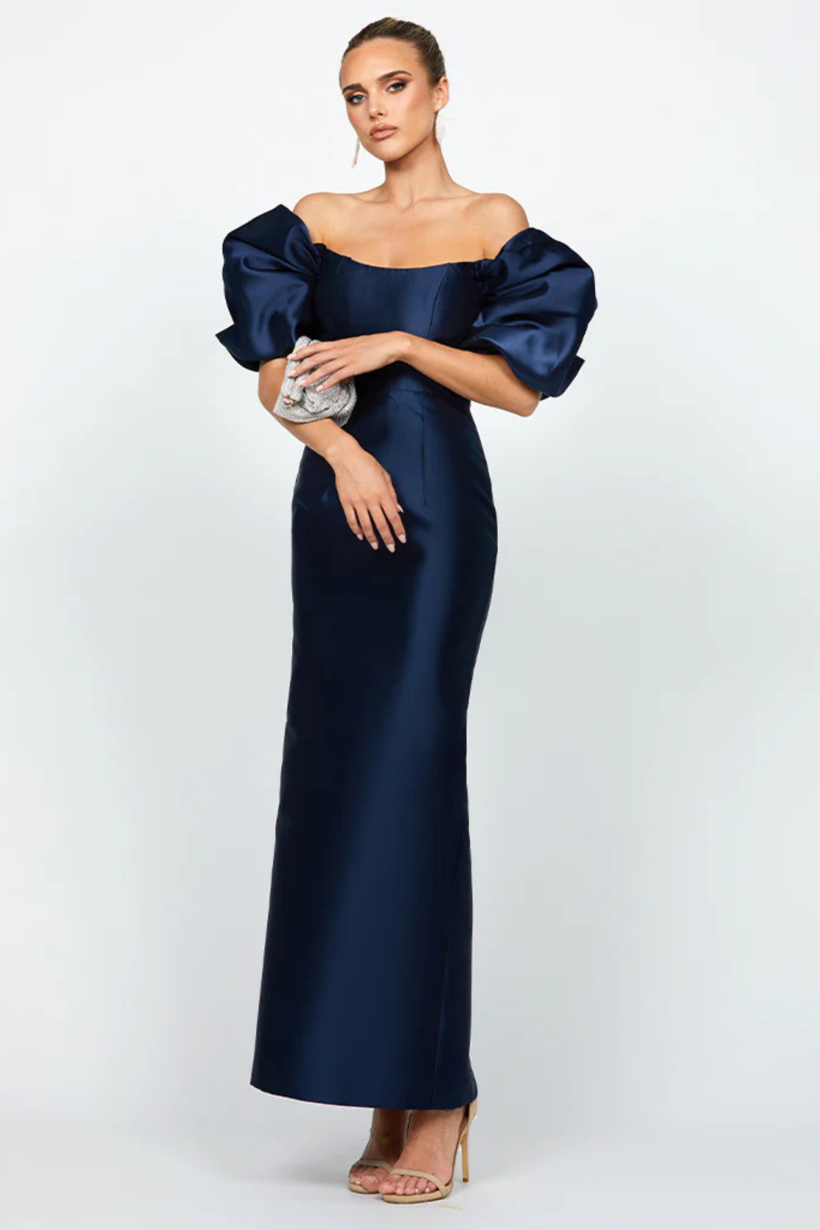 Make a commanding entrance in the Meredith Puff Sleeve Navy Gown by Mac Duggal. Dramatic puff sleeves frame your shoulders with timeless elegance, while the impeccable tailoring ensures a flawless silhouette that flatters every curve. This sophisticated navy gown transforms any occasion into your moment to shine—a bold statement piece that whispers confidence and refined style. Rent this show-stopping design and own the room.