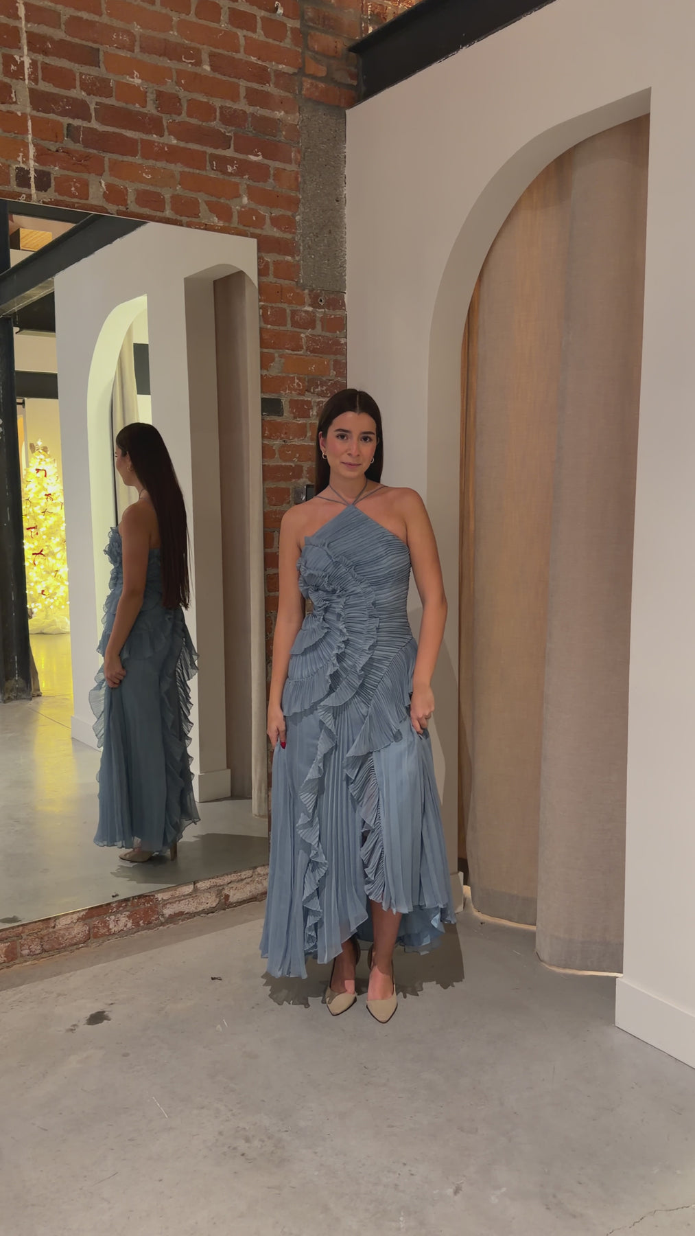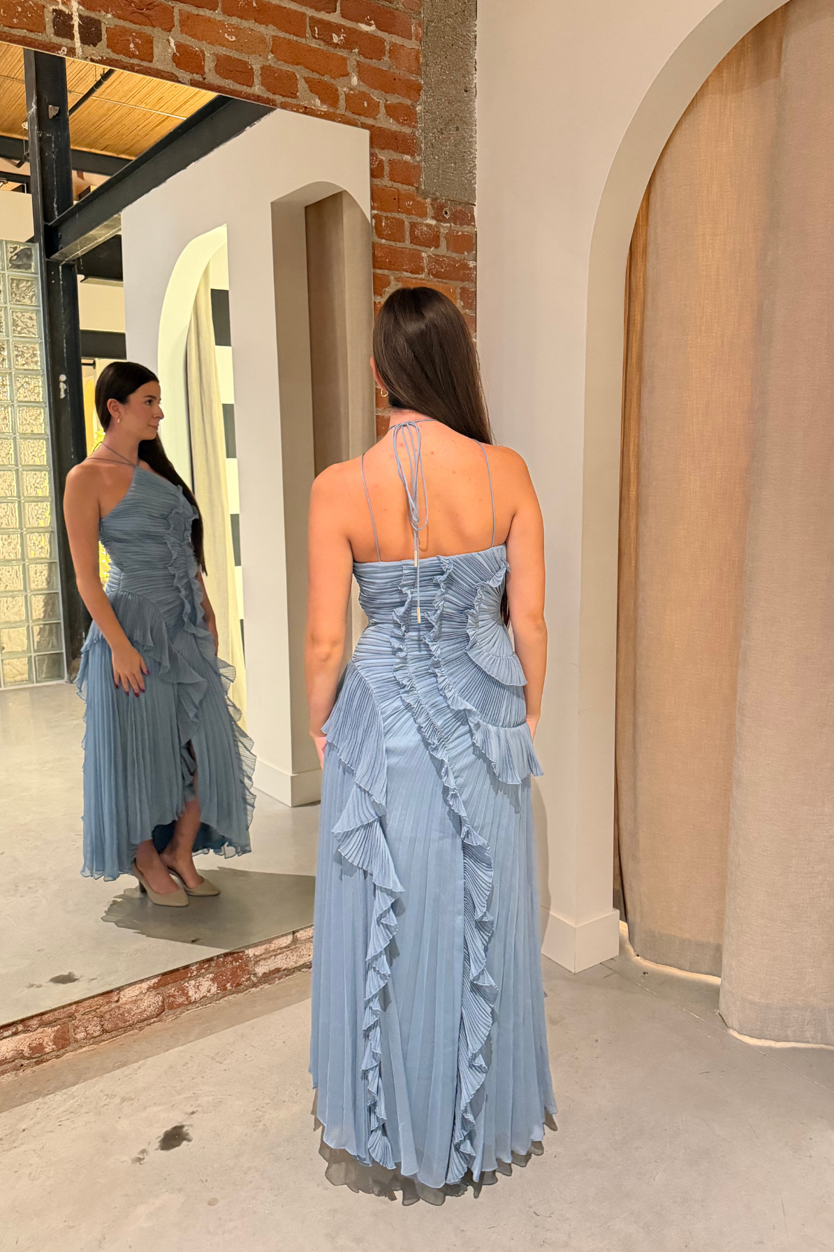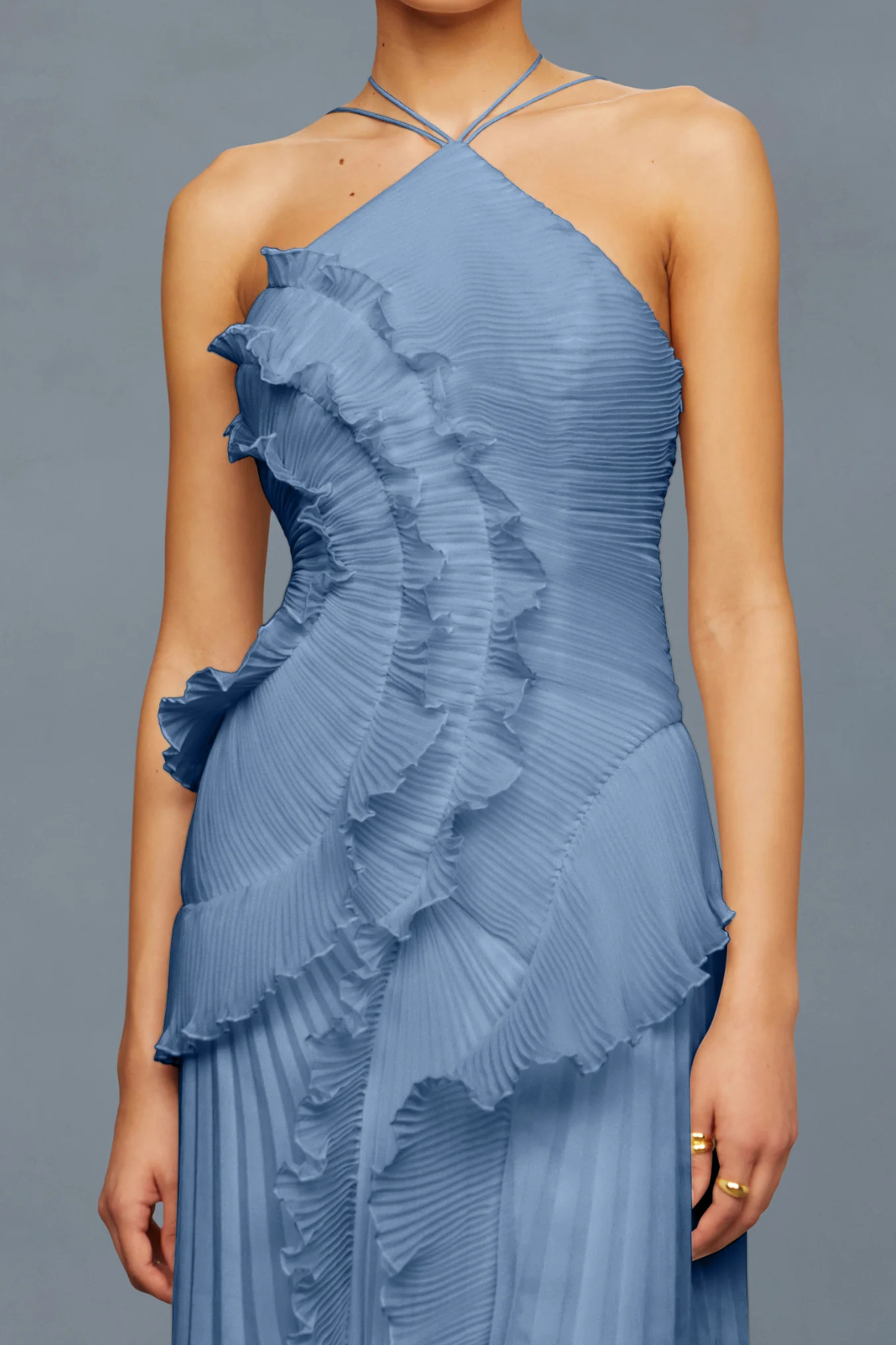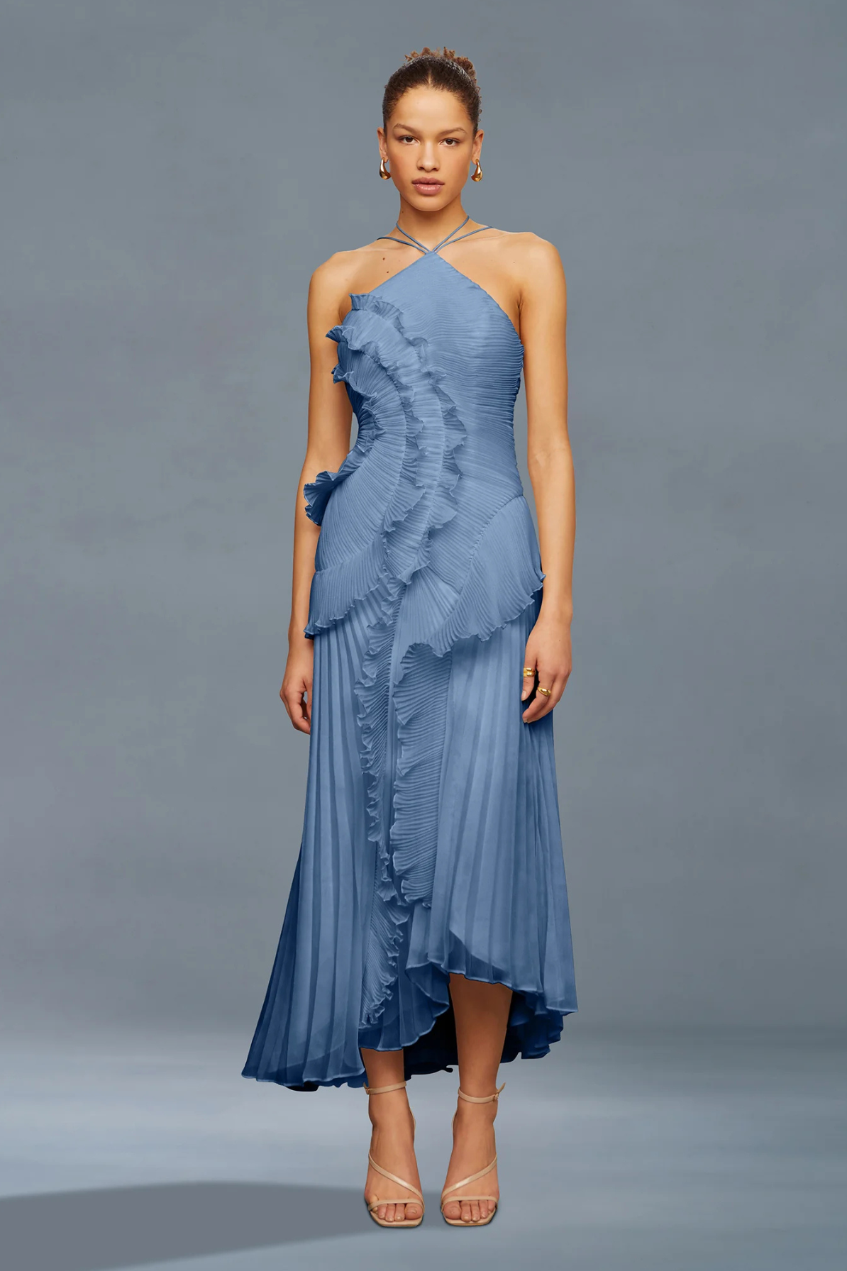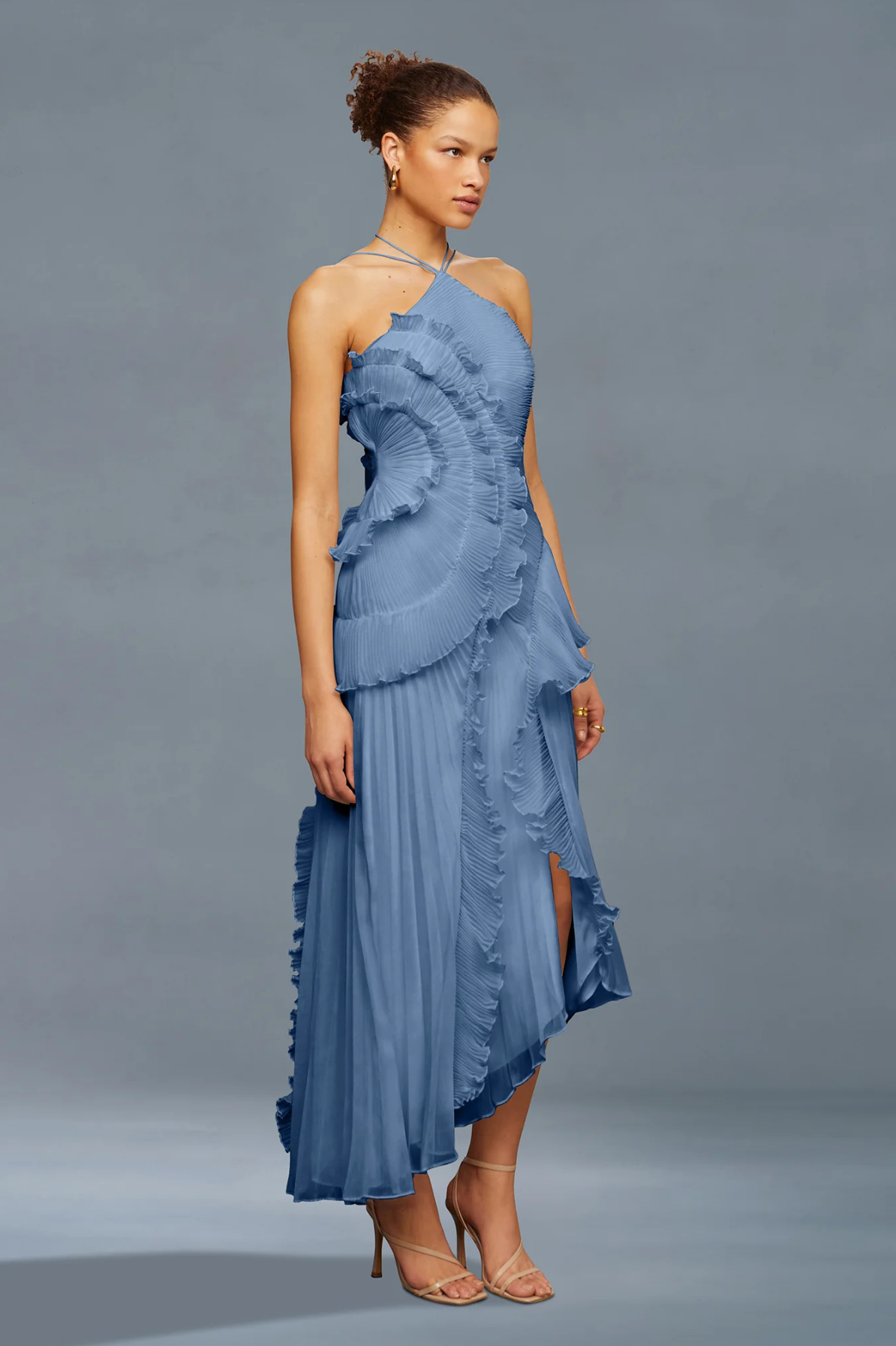 Drift into an evening of ethereal elegance with the Lorelie Halter Gown in Blue by AMUR. This enchanting rental piece features a romantic halter neckline that frames the shoulders beautifully, while an asymmetrical hemline adds modern intrigue to its dreamy silhouette. Delicate ruffles cascade across the design, creating movement and dimension that captures light with every step. Perfect for those seeking a sophisticated yet whimsical statement, this gown transforms any special occasion into a fairytale moment.