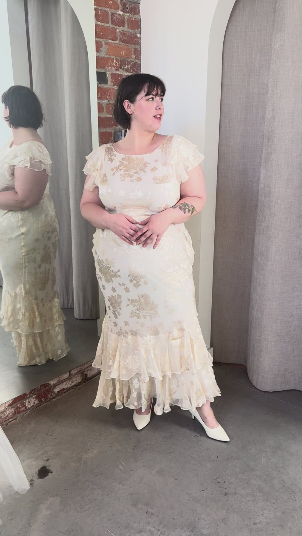 Step into timeless glamour with the Ordinia Bouquet Dress in Creme by Rixo London. This 1930s-inspired velvet devoré gown brings an elegant yet daring edge to engagement shoots or bridal moments. Its luxurious texture and chic silhouette flatter every curve, making a bold statement of sophisticated charm and vintage allure. Perfect for those who want to stand out with a unique blend of classic and contemporary style.